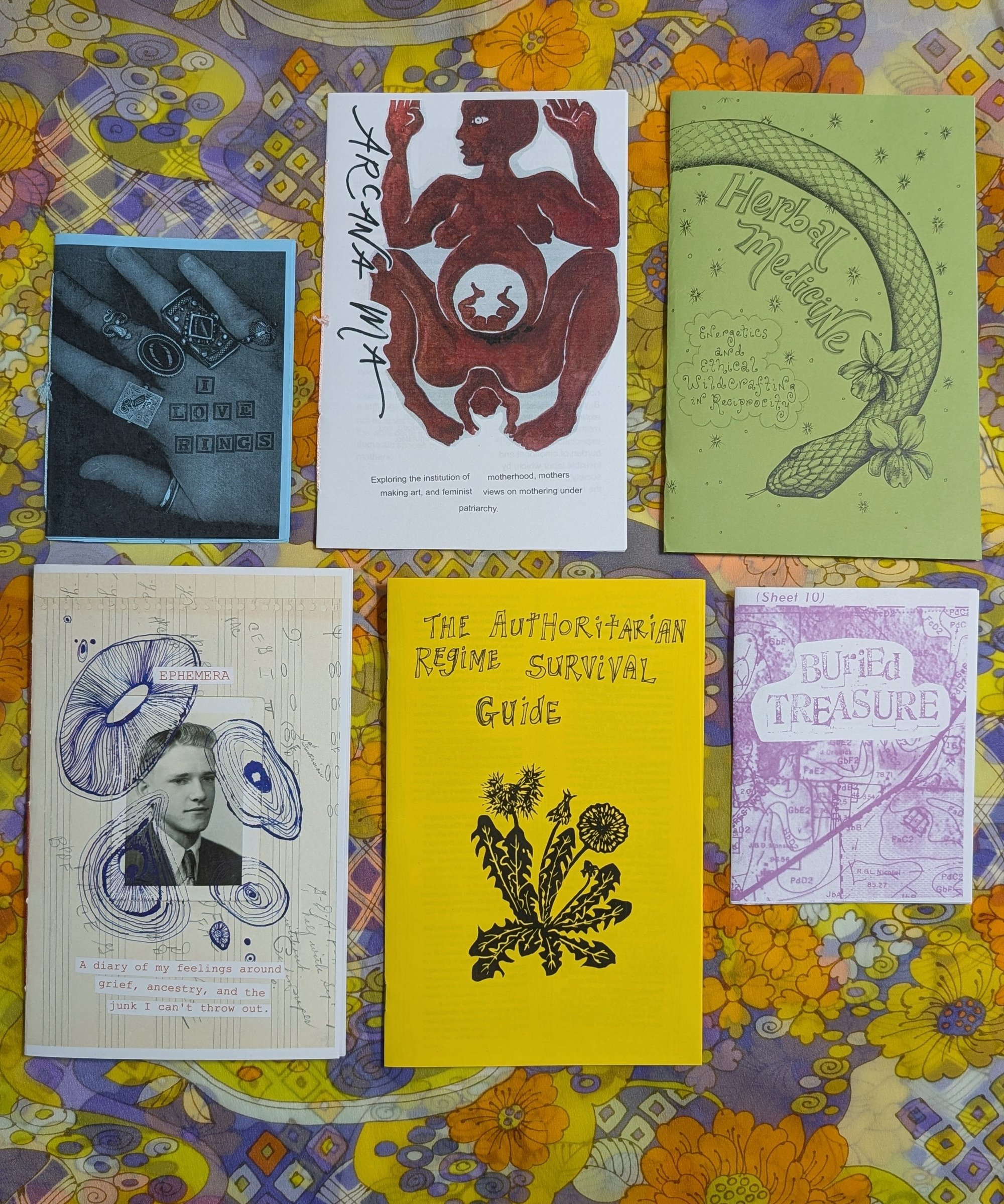 Chose from my half and quarter sized zines on politics, art, herbalism, and personal stories. All of my art is always handmade on paper.